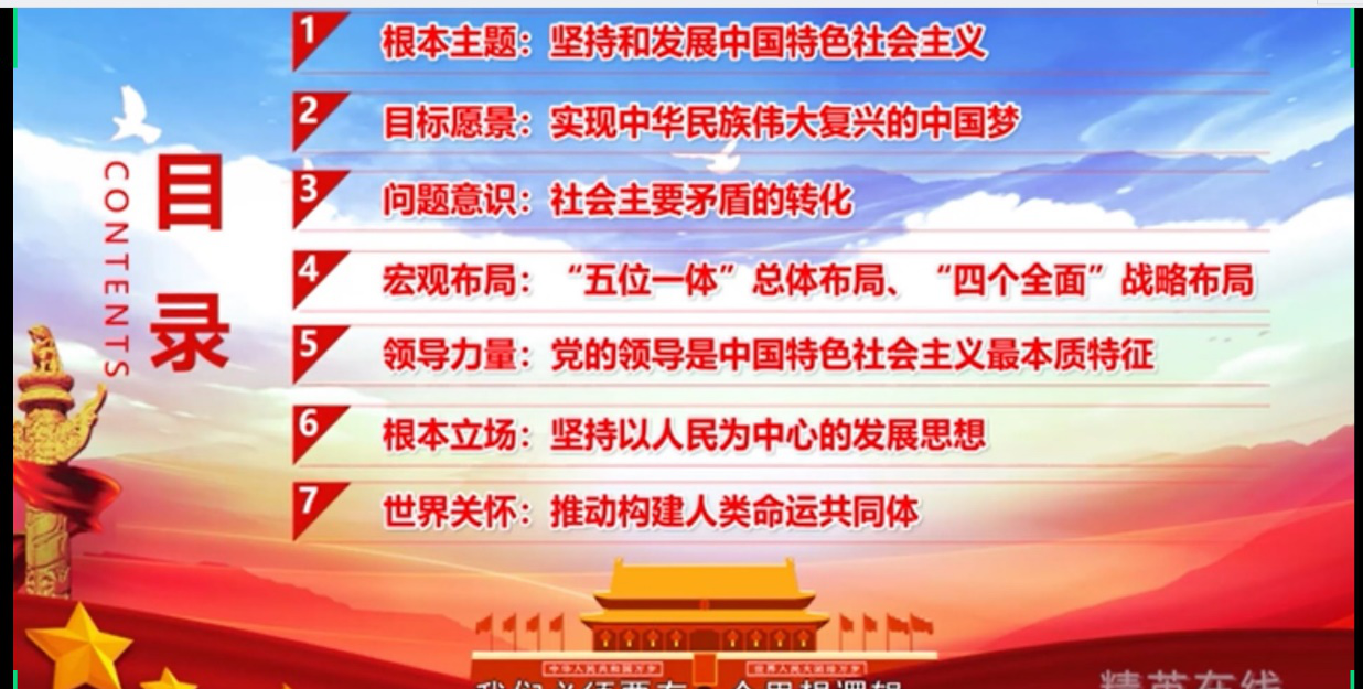 随后,全体学员在线观看了习近平新时代中国特色社会主义思想的相关网络视频课程,通过视频的方式从根本主题、目标愿景、问题意识、宏观布局、领导力量、根本立场、世界关怀等七个方面学习习近平新时代中国特色社会主义思想。