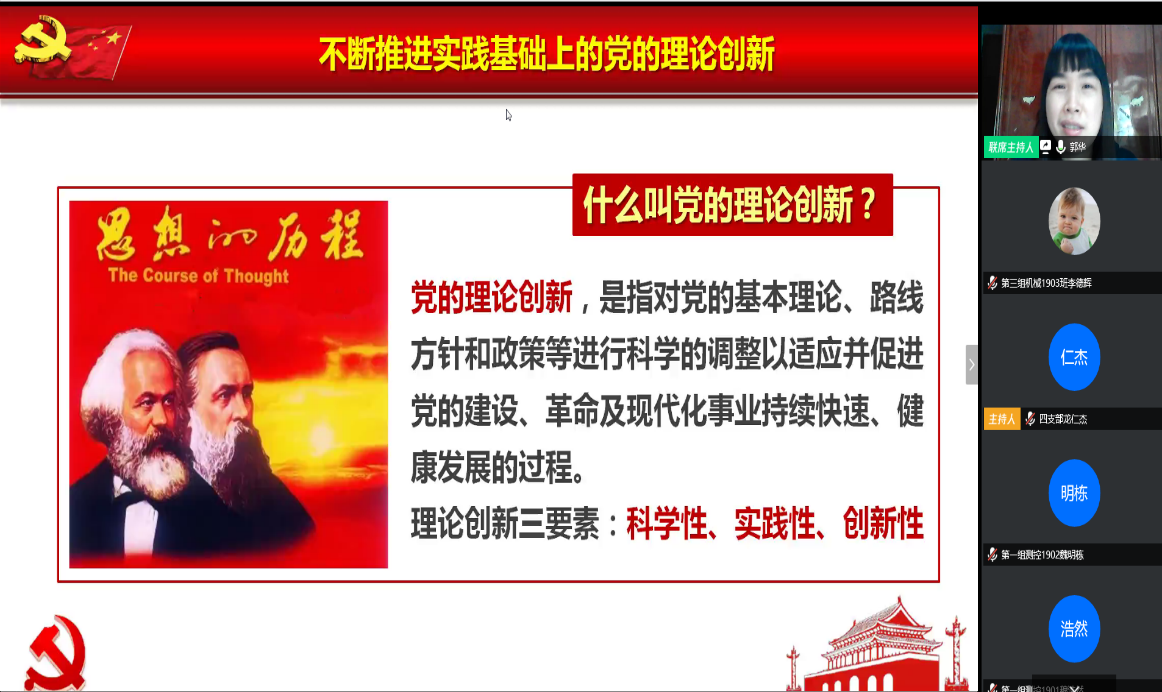本次党课共分为两个部分。首先,由马克思主义学院副教授郭华老师通过线上平台腾讯会议现场授课,主题是《不断推进实践基础上的党的理论创新》。郭老师主要从党的理论创新的基本线索、历史继承、实践本质、基本经验四个方面展开,结合实际让同学们进一步了解党的理论创新。