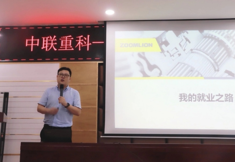 接下来,进入中联第一课分享阶段。混凝土泵送机械分公司结构厂龙华厂长分享了他个人在中联的就业之路。龙华厂长讲述了他个人从校招入司到成为生产管理干部的历程,强调了正确选择的重要性并告诉学员为何要成为一个靠谱的人以及如何用中联重科四精五心成为一个靠谱的人。最后,龙华厂长用曾国藩先生的“物来顺应、未来不迎、当时不杂、既过不恋 ”表达了对学员的嘱托与期望。