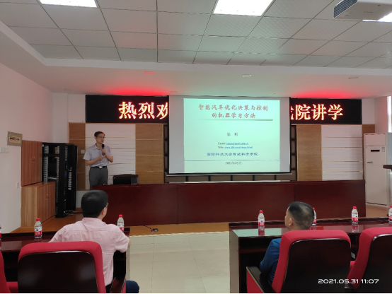 2021年5月31日上午11:00,国防科技大学智能科学技术系主任徐昕教授应汽机学院邀请,工科一号楼417多功能报告厅举行了题为“智能驾驶车辆优化决策与控制的机器学习技术”的学术报告。本次报告由汽机学院副院长胡林主持,院长杜荣华、副院长毛聪张志勇、刘鑫、高凯、易可夫等教师及部分研究生参加了本次报告。