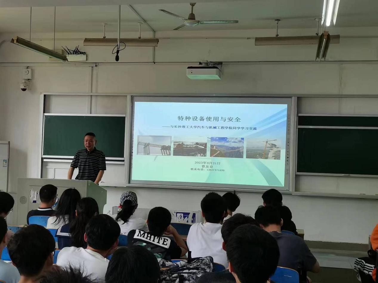 为深入开展校企合作开发课程,加快汽机学院专业课程建设改革的步伐,推进教学过程与企业实际对接,切实提高人才培养质量。2023年4月21日上午,在金盆岭校区6教202教室,汽机学院邀请湖南路桥建设集团有限责任公司资产管理部顾问、国家注册一级建造师、曾友良高级工程师开展了“特种设备使用与安全”专题讲座,资产管理部周树松高级工程师一同出席,2020级机制专业学生参与。