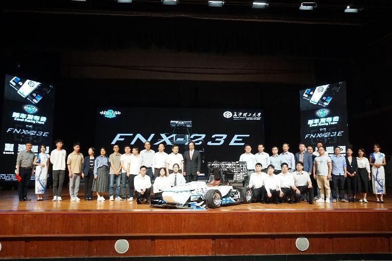 典礼上,还进行了2023年度LETOU体育平台方程式赛车队的新车发布仪式,车队队长张博轩对车队的成长历程进行了介绍,并对今年制造的新车FNX-23E进行了详细的技术介绍。汽机学院党委书记施一满、副院长(主持工作)胡林、车队指导老师伍文广、队长张博轩共同为新车揭幕。