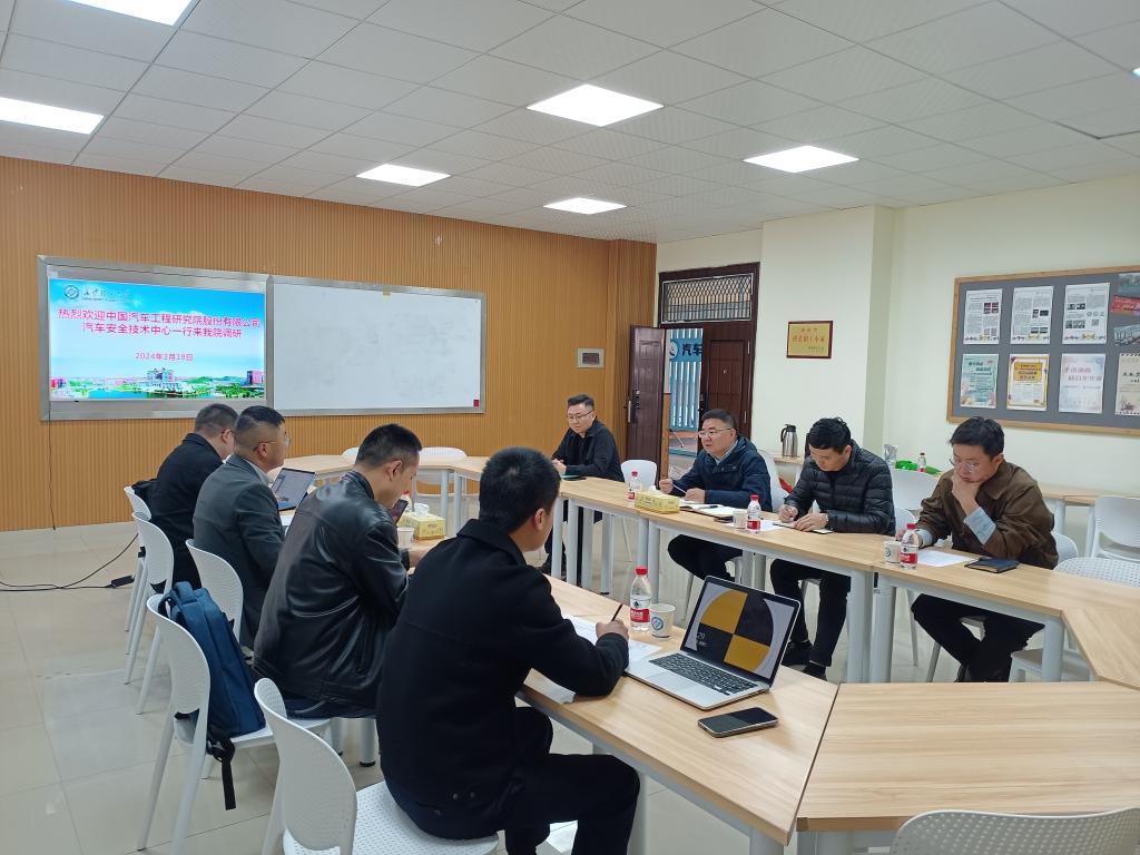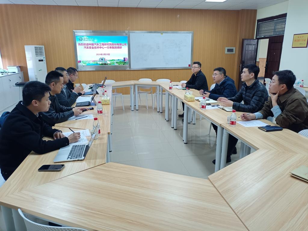 胡林对中国汽车工程研究院来的来宾表示热烈欢迎,并介绍了学院基本情况。王国杰介绍了调研目的和汽车安全技术中心的组织架构、建设发展状况,并表达了与学院进一步合作的意向。双方还就行业发展需要、科学研究、产品设计开发、学生实习实训、人才培养等方面工作进行了深入交流。