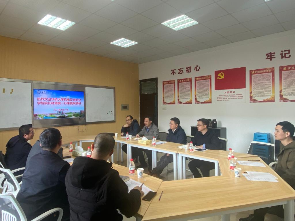 胡林介绍了与会人员,对林添良院长一行的到来表示欢迎,并简要介绍了学院及学科基本情况。林添良院长介绍了华侨大学机械工程学科的主要情况。随后,与会双方就青年教师引培、高水平学科竞赛、教学成果奖培育、重点科研项目申报、科教平台建设等事情开展了热烈交流和探讨。