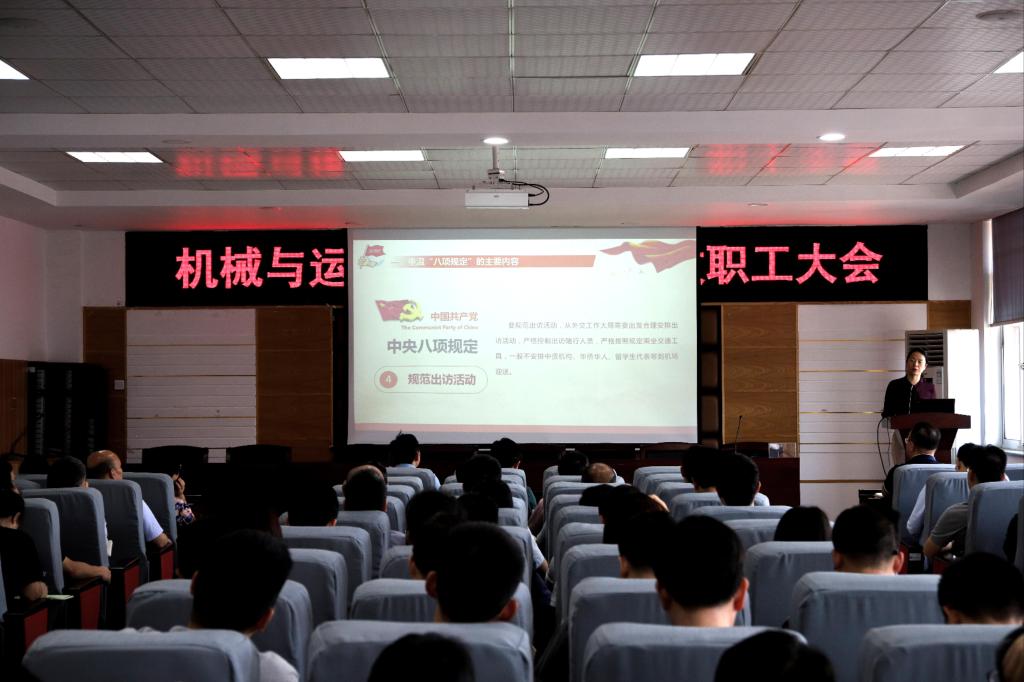为深入贯彻落实全面从严治党要求,深贯彻中央八项规定精神学习教育成效,5月13日下午,机械学院在工一B417会议室召开全体教职工大会,院党委书记孔伟红以《深入贯彻中央八项规定精神》为主题上专题党课,结合党中央决策部署和学院工作实际,系统解读中央八项规定精神内涵,明确纪律要求,推进作风建设。