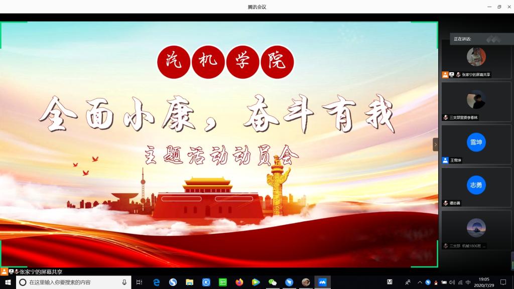 7月29日晚7点,汽车与机械工程学院组织召开“读懂中国”主题教育暑期动员会,本次会议通过“腾讯会议”线上平台举行,围绕“全面小康、奋斗有我”主题展开。学院党委副书记刘亚辉、关工委副主任谈正芳、党建辅导员王丽丽、学生党支部委员会成员和17、18、19级各班团支书出席会议。大会由张家宁主持。