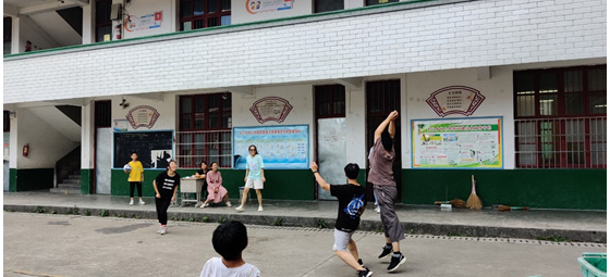 体育课上,孩子们拉着支教队员进行着丢沙包游戏,在天门的蓝天白云下,大家玩的十分尽兴。支教队员们笑的像个孩子一样。因为你们,我们的夏天一片清亮明朗,嬉戏声伴随着蝉鸣,听着孩子们讲述童年的烦恼,逐渐地红霞满天。