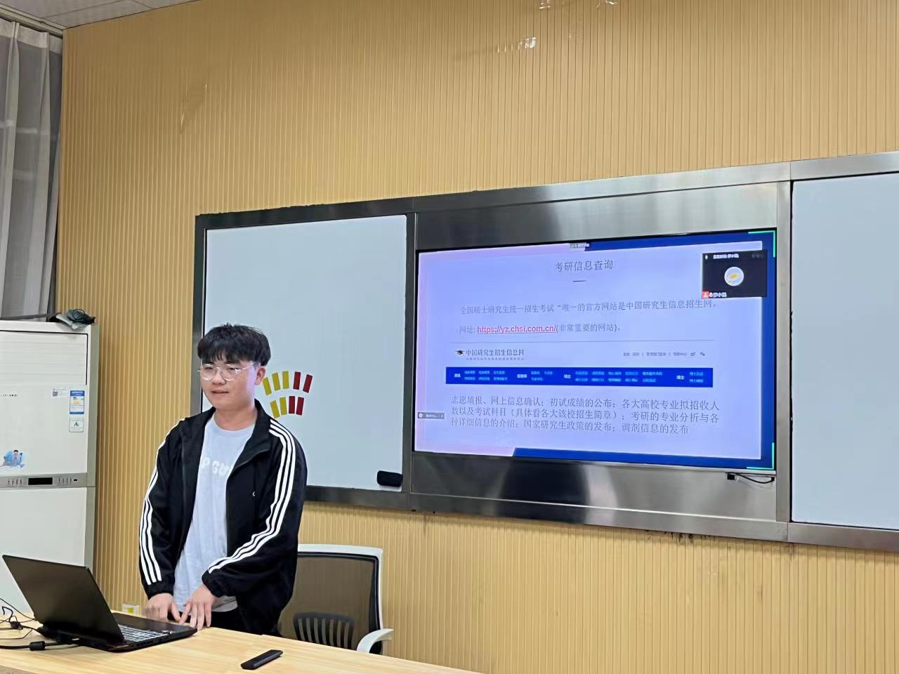 在本次考研分享会中雷衍文就近年考研的报名人数为同学们分析了当下的考研形势,及在择校择专业和考研过程中一些常见的问题。就考研过程中重要的时间线分享了他考研时的专业课复习计划表,以及专业课考试的题型和知识点,并将总结的知识点与同学们进行分享,同学们表示收获良多。陆治中就考研英语和政治两方面,向同学们推荐了优质的考研资料,分享了在复习过程中应该注意的时间节点,及如何逐个击破英语和政治的各大题型的方法。吴明治则从自身优势出发,向同学们讲述了考研数的题型组成和分数占比,就数学的备考规划分享了每个阶段应该明确的目标。在答疑环节,同学们就考研复习过程中的疑惑踊跃提问,三位同学结合自身情况分别进行解答。最后,三位同学对正在准备考研的同学们送出了最真挚的祝福。