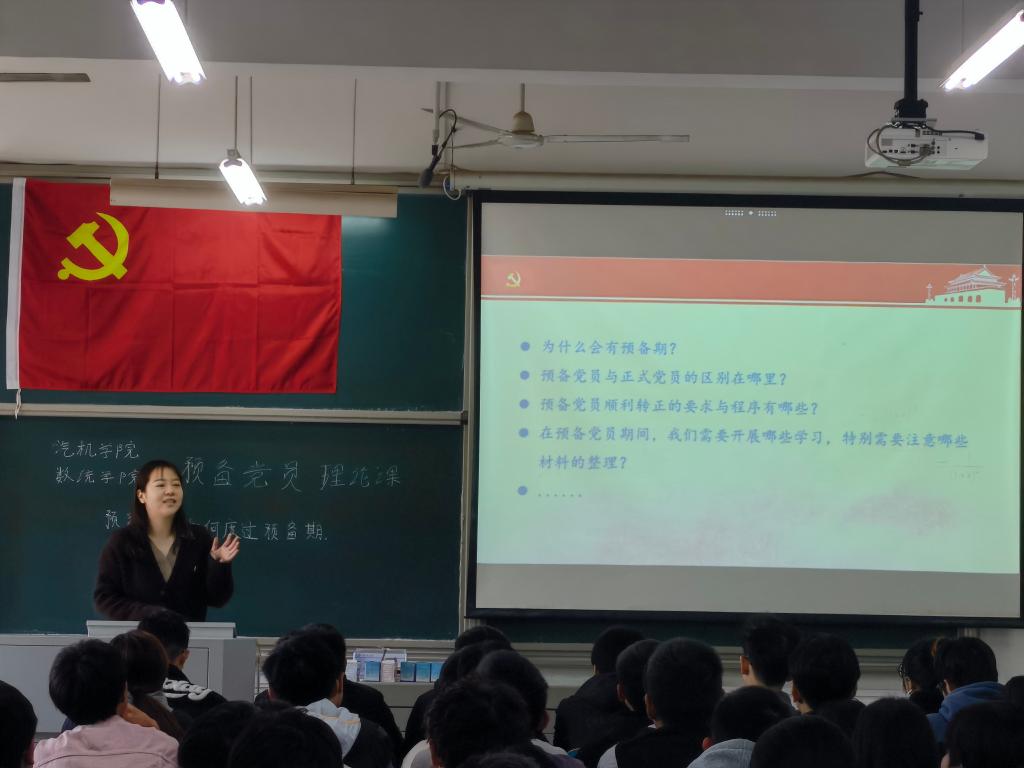 4月25日,汽机学院分党校在文科楼E206组织《过好预备期,做合格党员》主题党课,能动学院党建辅导员罗亦欧老师应邀主讲,汽机学院分党校第二十七期预备党员培训班全体学员参与。