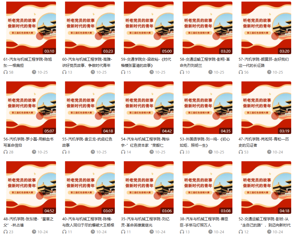 聆听党员故事,传承红色基因,赓续红色血脉。从第一届“学习四史,走好新时代长征路”和第二届“喜迎二十大,奋进新征程”到第三届的“听老党员的故事,做新时代的青年”三届红色音频大赛,共录制了130多个优秀的红色音频,进一步促进了长理研究生对红色精神的充分理解,培养长理学子牢记历史使命,把握时代脉搏,做一个有理想、有追求的新时代青年。