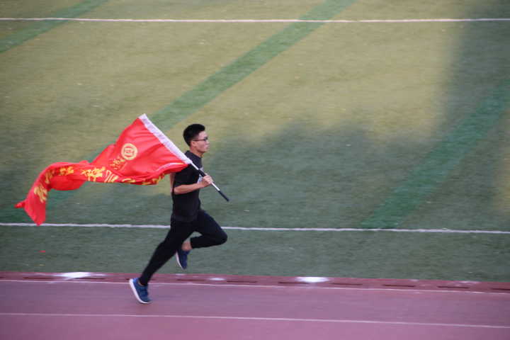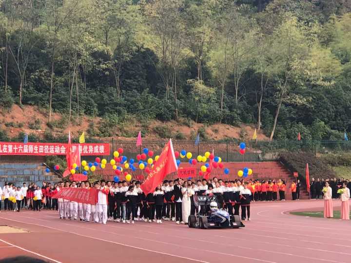 国旗班踏着整齐的步伐,带着国旗、校旗进入会场。各个学院代表队跟随着依次进入会场,汽机学院代表队则带着一辆酷炫的FNX-18赛车走过主席台,引来了观众席上一片喝彩,“汽车驰骋未来,机械支撑世界”,喊得是口号,更是汽机精神。在主持人介绍了出席的领导嘉宾及升旗仪式之后,校长发表讲话,他强调了奥运精神、体育精神,他要求青年学生应当追求“更快,更高,更强”的奥运精神。最后,由运动员代表、裁判员代表上台宣誓,校运会正式开始。