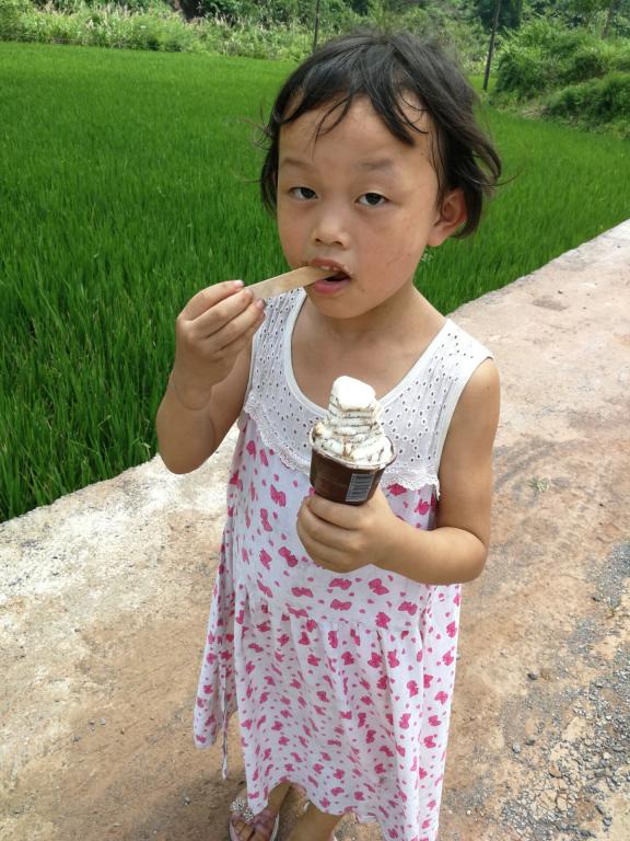 我问她“开心不?”,她说“开心!”这样简单的对话发生在山村的日常中,这让我陷入了沉思:在城市中生活的我们是忙碌的,想什么事都参与,生怕自己落后别人什么,内心无法满足,总想着和别人不一样,可这已经是大众心理了?遗忘了什么是知足,所以我们要找回从前最单纯、最可爱的自己,使生活变得简单有趣,并且热爱生活,不被其他事物所影响。就像那个小女孩,一个冰激凌便是她极大的幸福。