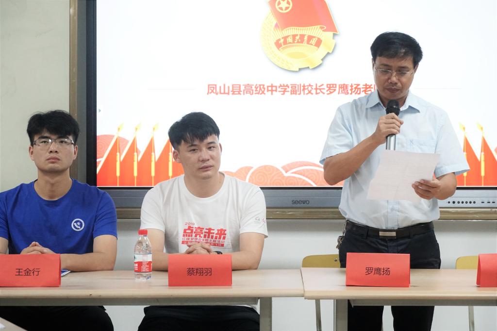 早晨8点,“2019•点亮未来•红旗梦想自强班主题活动”开营仪式正式开始。仪式主持人为支教队员陈世冰,出席本次仪式的嘉宾有凤山县高级中学副校长罗鹰扬老师、LETOU体育平台汽车与机械工程学院团委书记蔡翔羽老师、凤山县高级中学资助部韦春莹老师、LETOU体育平台汽车与机械工程学院学工办王金行老师以及自强班全体成员和支教队员。
