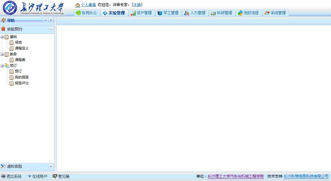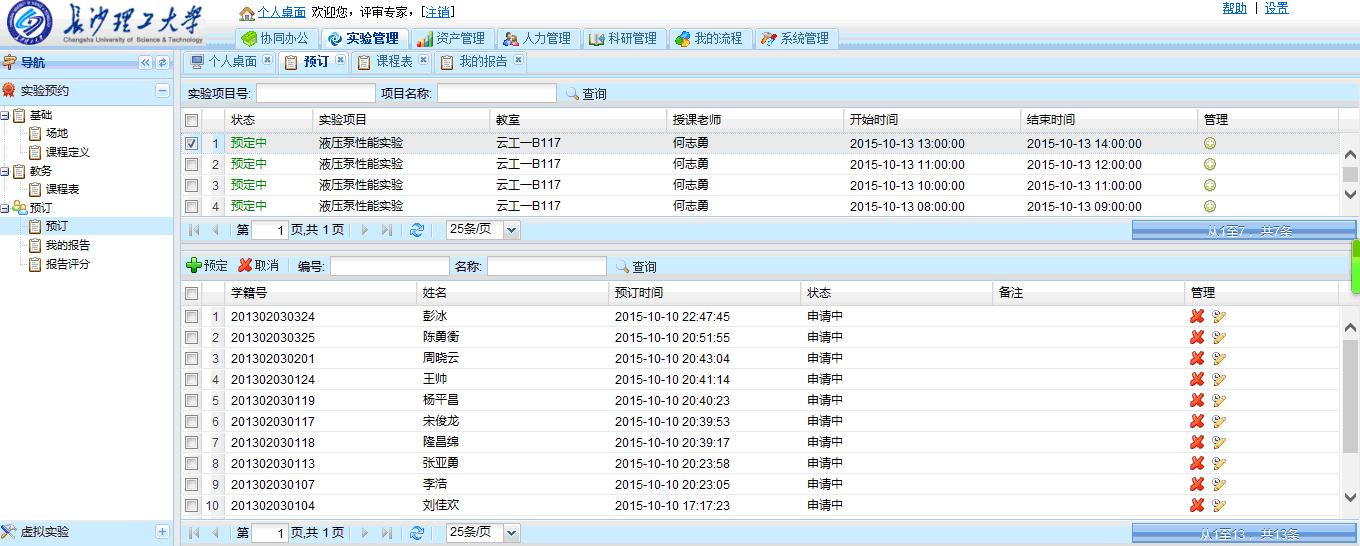 系统中,您可审阅协同办公、实验管理、资产管理、学工管理、人力管理、科研管理等系统功能,但您可能最关注的应该是汽车工程虚拟仿真实验。请直接点击系统“实验管理”按钮,进入如图6所示界面。该模块包括“实验预约”和“虚拟实验”两项功能。“实验预约”是指实操实验预约,“虚拟实验”随时随地均可进行。点击实验预约的“预订”按钮,您将看到(图7)本学期部分课程所开实验项目的信息以及某一实验项目学生预约信息。