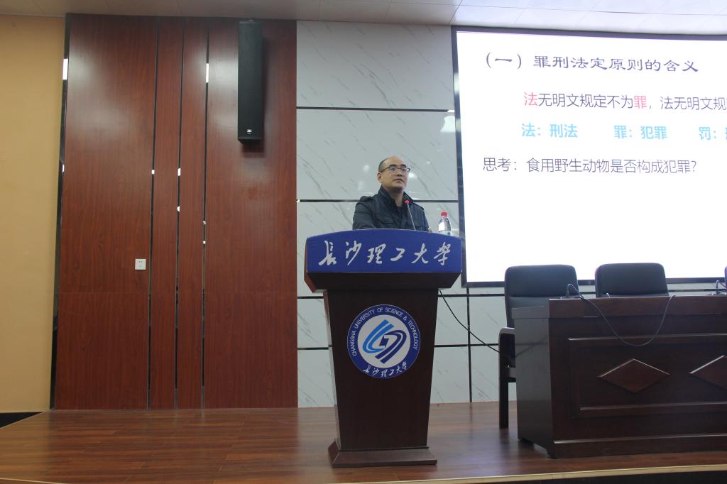 讲座伊始,申老师简单说明了刑法离我们并不遥远,引出了讲座的主题。申老师用食用野生动物不能判为犯罪这项事例,说明罪行法定原则是根据法律来判定是否犯罪。接着从权利牵制和个人自由两个角度,分析了罪行法定原则存在的思想基础。而后,运用事例解释罪行法定原则的内容,向同学们展示了法律的严谨性。