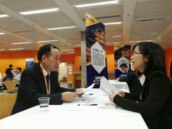 9月15日,黄立宏在法兰克福专场招聘洽谈会期间,与德国欧福大学研究生学科主任朱开富教授进行了会谈,初步达成了合作办学意向。