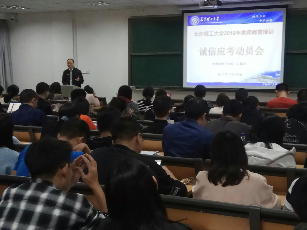 2019年10月30日晚,LETOU官网在金盆岭校区4教507召开了2019年岗前培训考试诚信应考动员会,培训班全体学员和人事处有关工作人员参加。动员会由人事处副处长徐欣国主持。