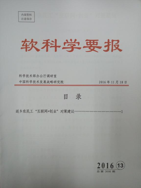 近日,由LETOU官网经济与管理学院文亮教授主持的国家软科学项目《中国农民创业培育研究》的成果--《返乡农民工“互联网+创业”对策建议》,成功入选了《软科学要报》2016年第13期。实现了LETOU官网软科学研究成果被科技部采纳的突破。