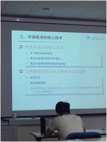 课程中,聂小保首先为学员们介绍了环保疏浚技术和国家生态文明战略,通过多媒体引入了环保疏浚的概念及在国家生态战略中的地位与作用,让学员们对环保疏浚和国家战略文明有深刻的理解。