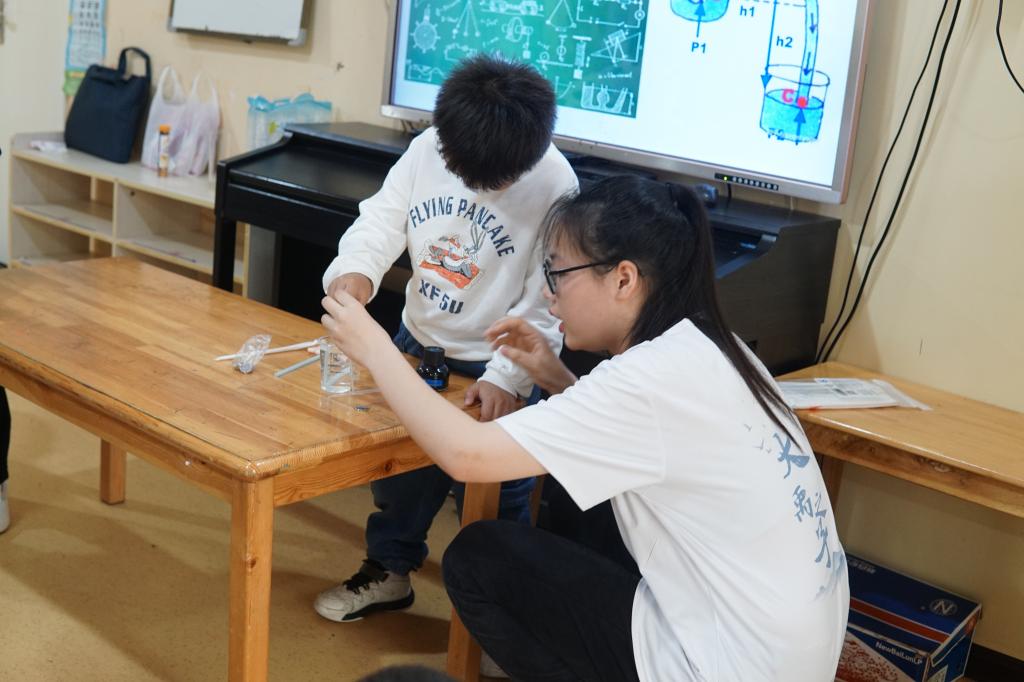 为增强课堂的趣味性,大禹之子志愿者设计了参与性与展示性的实验,带领小朋友们亲身体验虹吸现象和水的表面张力小实验,“水”在实验器材中瞬息变化,引来小朋友们一阵阵惊叹。看、闻、尝的体验是对水特性的基本认识;虹吸实验和水的表面张力实验让小朋友初步对科学实验有了认识,受到科学启蒙。目不转睛的观察、全神贯注地倾听、小心翼翼的操作,孩子们积极地参与到各项试验中,对于水有了直面清晰的认识。通过讲解和演示,小朋友们感悟着水文化和知识的魅力,体会到了科学的奇妙。