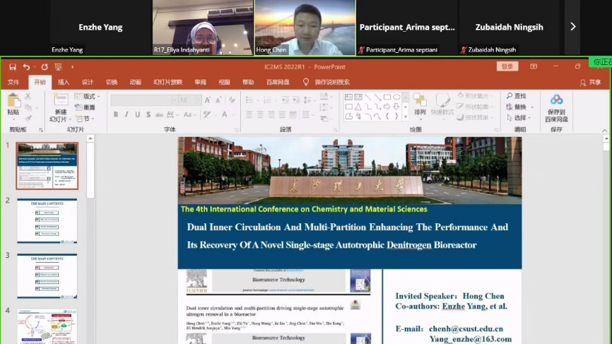 2022年9月8~9日,水利与环境工程学院陈宏教授课题组在线参加了国际会议The 4th International Coference on Chemistry and Material Sciences(IC2MS)。第四届IC2MS在印度尼西亚举行,旨在探究化学,材料和生物技术在可持续发展目标中的作用。会议由Universitas Negeri Malang(玛琅国立大学)承办,共有来自印度尼西亚、马来西亚、日本、中国等多个国家的上千名科学家和学者同行及研究生参加。