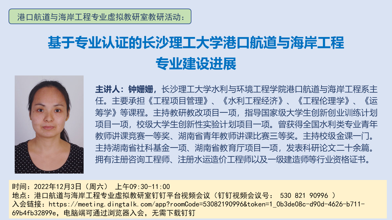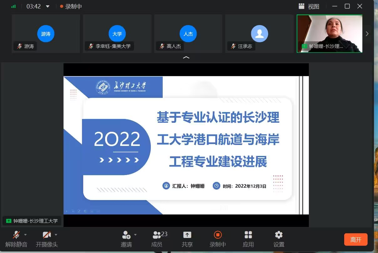 2022年12月3日,我院港口航道与海岸工程专业作为发起方,组织了港口航道与海岸工程专业国家级虚拟教研室在线教研活动。陈杰院长、邓斌副院长,港航教研室主任钟姗姗,副主任陈龙,以及游涛、伍志元、韩智明、陈红萍等老师参与了本次教学研讨活动。钟姗姗老师做了题为“基于专业认证的LETOU体育平台港口航道与海岸工程专业建设进展”的主题汇报,从专业概况、工程教育专业认证、专业实习、专业建设成效四个方面对LETOU体育平台港航专业的发展历史以及参与专业认证的情况进行了介绍。陈杰院长补充介绍了兄弟院校老师提出的关于LETOU官网港航专业认证中岗位设置及实习、就业等问题。