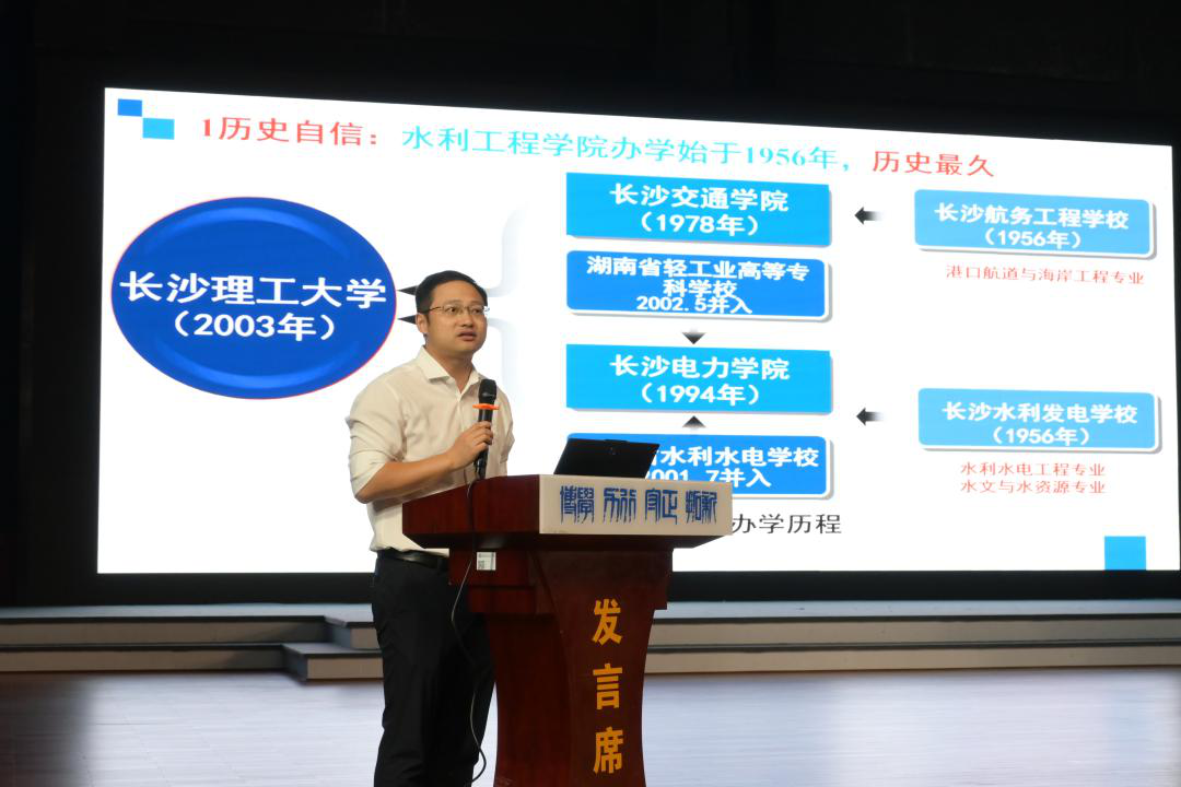 院长陈杰讲授新生第一课,他由学校和学院悠久的办学历史谈起,通过丰富详实的数据与实例,深刻阐述了学院在历史积淀、优势特色、学科建设、专业设置、教育质量、国际声誉、成长路径、文化底蕴、平台优势以及行业展望这十大方面的自信根基与坚实底气。授课中,陈杰寄语全体新生坚定长理水利历史自信、优势自信、学科自信、专业自信、培养质量自信、国际认可度自信、个人发展自信、文化自信、平台自信、行业前景自信等“十个自信”,学水利、爱水利、干水利,创造属于自己的精彩水利人生。