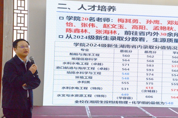 院长陈杰做《2024年水利与环境工程学院工作总结》报告。陈杰从党建引领、人才培养、专业建设、师资队伍、科学研究、平台建设六个方面总结了学院2024年的收获。学院坚持党对中心工作的引领,获得了湖南省教育工委“先进基层党组织”、全国水利类专业课程思政教学案例一等奖、海洋航行器设计与制作大赛国家级二等奖等奖励荣誉,新增国家级项目5项、省级项目8项。院工会主席孙士权做《水利与环境工程学院2024年度工会工作总结》、《水利与环境工程学院2024年度工会财务总结》报告。
