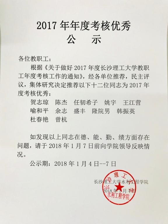 2017年年度考核优秀公示