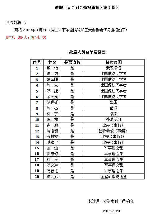 教职工大会到会情况通报(第3周)
