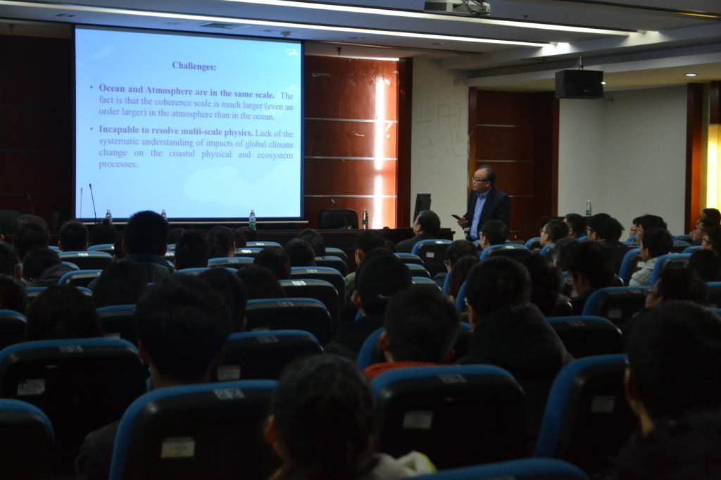 陈长胜从一张精细的全球温度变化遥感图给大家介绍研究海洋的大环境及背景开始,利用丰富的研究结果展示北极和南极冰圈范围、淡水量总量的变化,并进一步讲解海面平均水位、风暴增水、海浪增水的概念及相关自然灾害等,突出研究海洋科学问题的重要性以及多学科相互合作的必要性。由此,陈长胜介绍了从地球系统模型的应用、思考,到带领团队开发和创造了非结构网格有限体积海洋模式(FVCOM)的过程。目前该模型在38个国家得到广泛的应用,同时陈教授介绍了其与中山大学合作成立的团队SYCIM。他通过详实的数据案例展示模型的科学性和先进性,并分享了在寻找失联飞机、人员、沉船等实际应用过程中的实用性。陈长胜精彩的报告引起了在座师生积极提问交流,就FVCOM模型在海洋与内河的可用性及差异、使用数据的分辨率、海浪运动过程破碎性模拟等问题进行了热烈讨论。