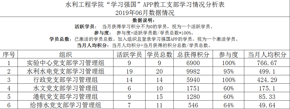 根据学院《关于开展“学习强国”平台月度学习先进个人及先进支部评比的通知》相关要求,6月份,我院教工党员学习强国学习“先进个人”为:李毅、石月珍、喻玲娜、朱旭东、陈杰、禹丽娥;学生党支部、团支部学习强国学习“先进个人”为:刘璐、曾喆、鲁稳杰、汤韬、杨笑笑、吴海华、曹俊。教工支部学习强国学习“先进集体”为:水利实验中心党支部;学生支部学习强国学习“先进集体”为:18级研究生直属党支部。