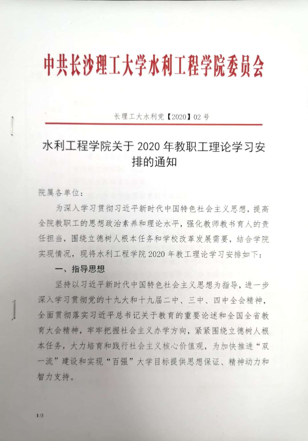 水利工程学院关于2020年教职工理论学习安排的通知(长理工大水利党【2020】02号)