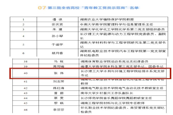 在湖南省高校党组织“对标争先”建设计划第三批项目评选中,我院教师张伟同志获评“青年教工党员示范岗”。