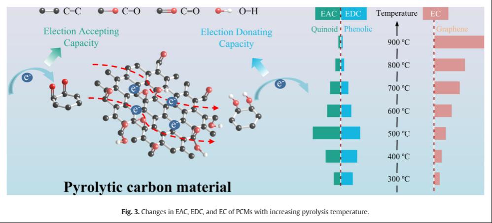 热解炭材料具有多种表面功能,是一种环保、经济的吸附材料,被广泛应用于去除有机和无机污染物。近年来的研究表明,PCMs作为ESs在促进持久性有机污染物(POPs)的厌氧转化方面也表现出了优异的性能。大量研究表明,PCMs具有良好的电子穿梭能力(ESC),可以促进持久性有机污染物的厌氧还原转化。