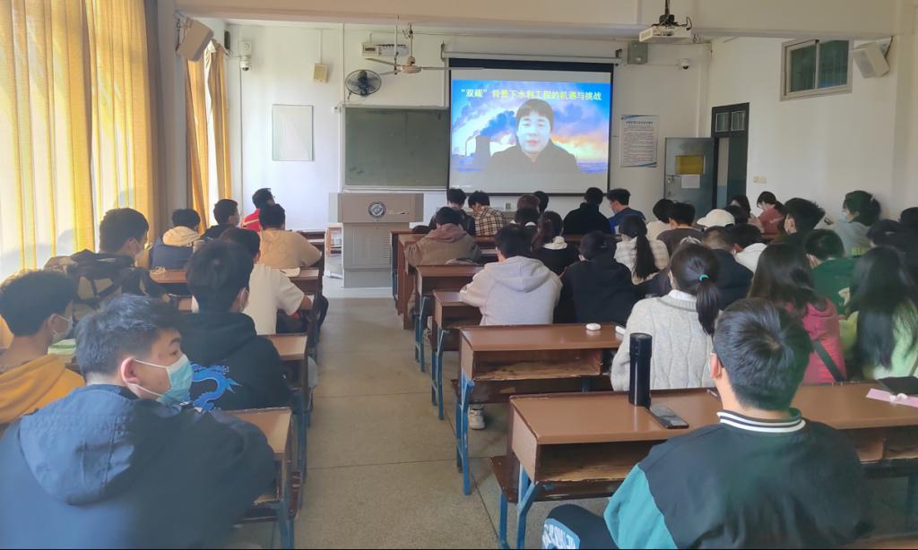 鲍海燕老师从三峡工程为着手点,以案例法深入浅出地为学生介绍了水利水电工程专业的主要工作内容,同时以“双碳”背景为着力点,重点阐述了新情势下水利水电工程在抽水蓄能工程建设、西南水电开发等领域的发展潜力。她最后也对我院水电专业的情况作了详细介绍。