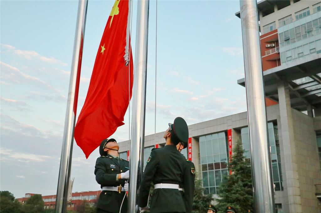 7点整,在清晨的阳光中,护旗队迈着整齐划一的步伐,将国旗护送到升旗台前。在庄严的国歌声中,五星红旗冉冉升旗,全体师生齐声歌唱《国歌》,表达爱国之情。升旗结束后,2018级全体同学在国旗下庄严宣誓,誓词铿锵有力,慷慨激昂,表达爱国之情与强国之志。
