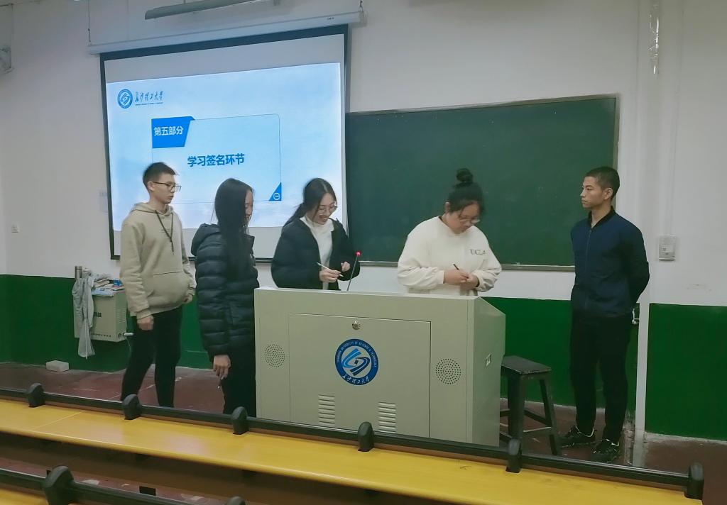 班会开始前,班长强调了班会纪律并提醒同学们认真听讲、做好笔记。会议伊始,班长对四级考试和期末考试的相关注意事项进行了介绍,并针对重点要求做了详细注解和反复强调。随后,班长带领同学们逐字逐条学习了修改后的《LETOU体育平台学生考试违规处理办法》,让同学们了解并自觉遵守考规考纪,诚信应考。同时还列举了3起因考试舞弊被开除学籍的反例为大家讲述了考试作弊的危害和严重后果,警示同学们绝对不可心存侥幸进行考试舞弊。在最后的宣誓和签字环节中,同学们一齐喊出“全力备考、诚信应考”的誓词,排队签下自己的名字时,这微凉的空气中,每一颗火热的心脏都在猛烈的跳动。