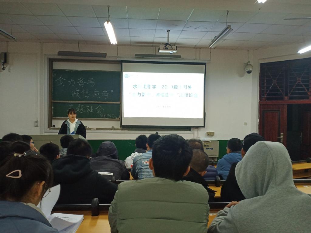 全国大学生英语四级考试和期末考试即将举行,为了严肃考风考纪,营造诚信应考的良好氛围。12月8日-12月9日,水利工程学院在金盆岭校区14号教学楼召开“全力备考,诚信应考”主题班会,此次班会由各班班长主持,2019级全体本科生参加。