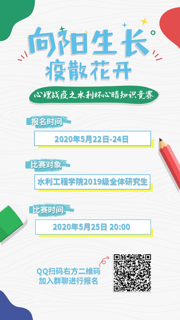 2020年5月25日晚8:00,由水利工程学院心晴协会主办的疫情心理知识竞赛在腾讯会议线上开展。本次比赛以“向阳生长,疫散花开”为主题,由刘金龙、吕倩主持,参赛选手是来自2019级研究生的10支队伍。