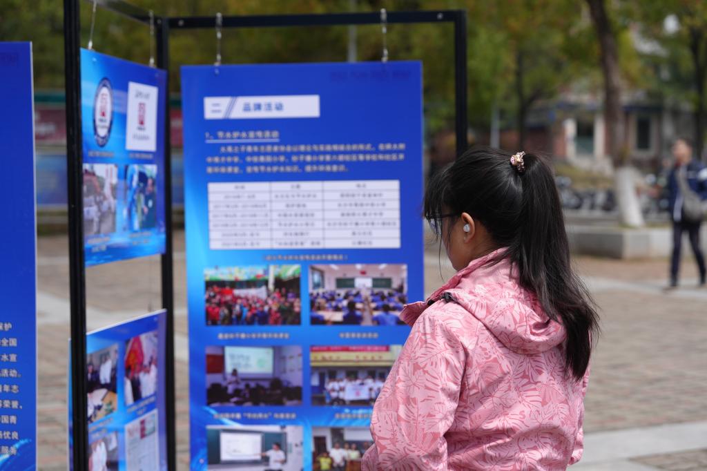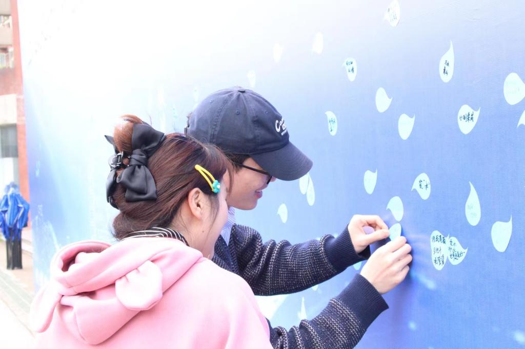 蓝色天空、蓝色帐篷、蓝色展板……一片蔚蓝映入眼帘,让人仿佛置身水世界。同学们书写水滴格言,将每一颗“小水滴”贴在打卡墙上,“上善若水,利万物而不争”“水能载舟,亦能覆舟”“绿水青山就是金山银山”……构成大千水世界。