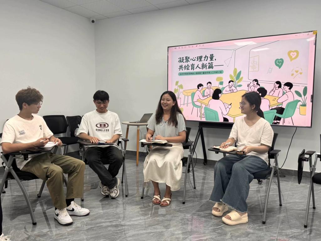 为深入贯彻“以生为本”教育理念,深化院校两级心理健康工作协同机制,加强水利学院与校级朋辈力量的联系与合作,6月12日晚19:00,水利学院在行健轩六栋“大禹之子”一站式育人社区举办心理育人工作研讨会。会议由李芷仪主持,学院心理辅导员王正博、校朋辈代表及院心理部全体成员共同参与。