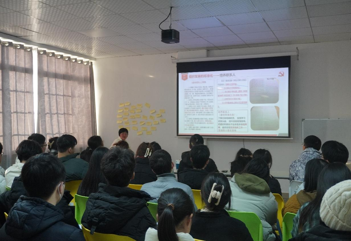 银波以“创建先进组织,培养可靠、可信、可用水利先锋”为题展开培训,她从“组织架构科学化”、“组织发展标准化”、“学习教育多样化”、“发挥作用系统化”、“档案材料规范化”五个方面对党员发展流程、培养考察环节及作用发挥进行了全面的讲述。她指出党建职能工作组与各党支部之间要加强联动,凸显组织的功能,强化培养联系人、下班党员的身份意识,确保作用发挥到位,并通过大量的案例和培育成果强调党员教育学习要多样化、多元化、多维化,落实好党总支创新学、支部集中学、党员自主学三位一体的学习模式,强化理论武装,在实践工作中找准方式方法。最后,她对党员发展工作流程及各阶段档案材料进行讲解,明确了各个发展阶段学生本人、培养联系人、所在支部及职能工作组的职责,进一步强调了档案材料的重要性。