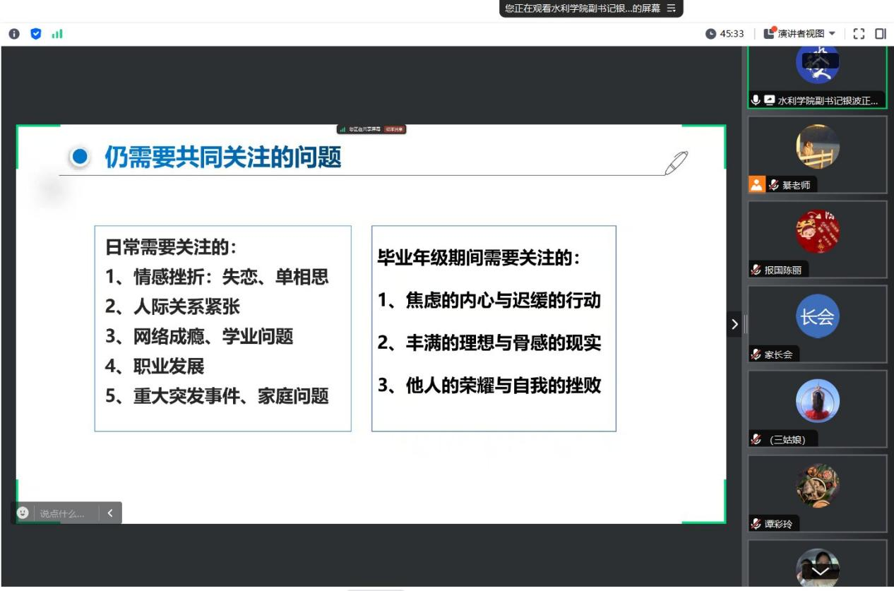 为进一步加强家校联动,为学生的职业规划提供更有力的支持。9月26日晚,水利学院召开了“家校协同育人,共筑成长同心圆”2021级本科生家长会,院长陈杰、院党委副书记银波出席本次会议,近300名家长线上参会,年级辅导员綦丽主持会议。