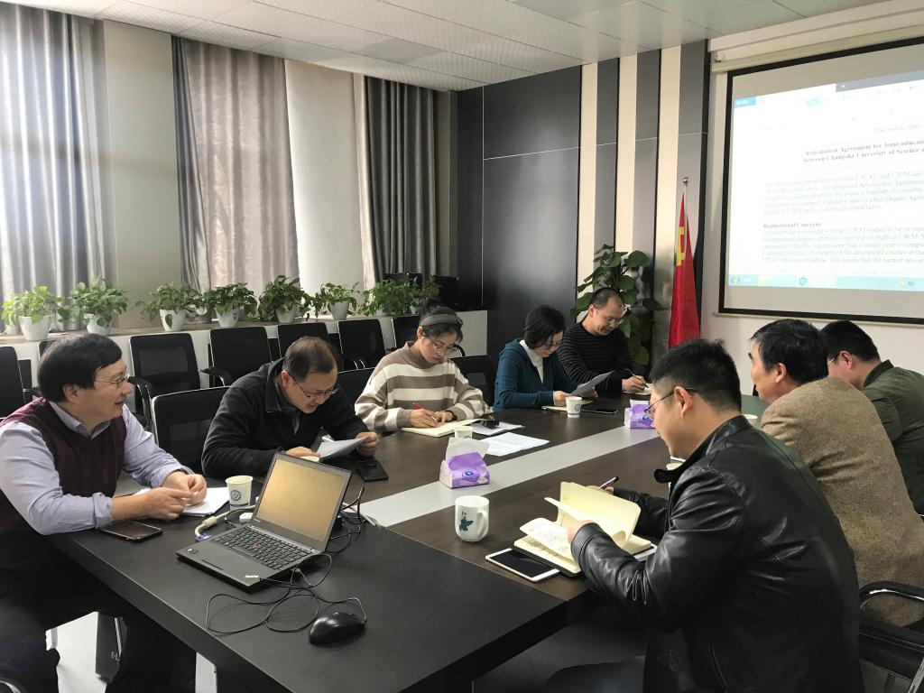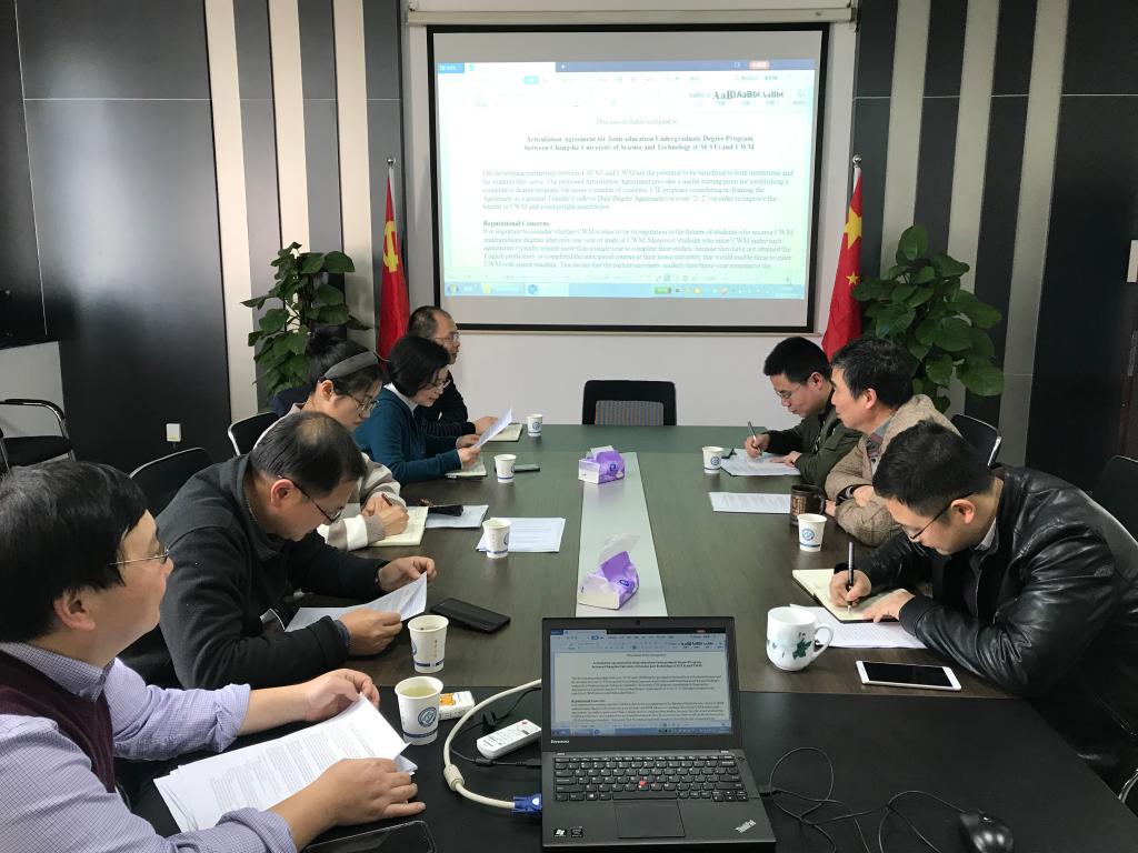 会议首先由胡世雄介绍了威斯康辛大学密尔沃基分校基本情况和目前该合作办学项目的进展情况,并传达了美方对项目提出的建议和意见。吴迪龙和陈瑜分别代表国际交流处和国际学院对提出相关问题进行了解答。随后胡旭跃代表学院发言并表示一定会积极配合国际交流处和国际学院做好本次项目的推进工作。会议最后对项目下一步阶段的工作安排进行了讨论和布置。