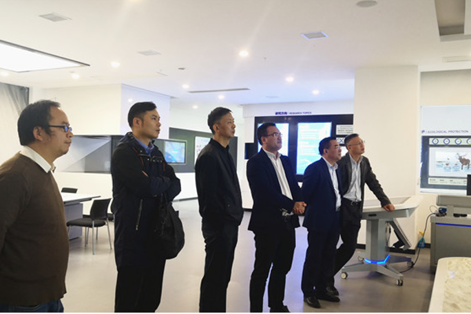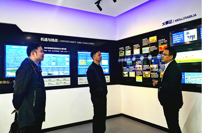 实验室邓斌老师向张秋生一行介绍了洞庭湖基本概况、目前所面临的机遇与挑战、实验室发展目标,以及洞庭湖实验室的建设历程、主要研究方向等;他重点介绍了智慧洞庭综合信息化平台,分享了洞庭湖实验室筹建及综合信息化平台搭建的经验,并规划了下阶段实验室将联合水文、交通、农业、自然资源等部门建立全省水灾水害预警信息化服务平台,服务于我省地方社会经济建设。