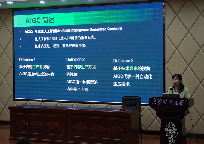 张雪梅向同学们介绍了AIGC的特征、发展史、规模和类型,以生动的应用案例讲解了AIGC与传统信息资源的联系与区别以及AIGC对教学及科研的积极和消极影响。她指出,AIGC时代的到来标志着人类学术科研方式进入了新篇章,我们要时刻保持独立且强大的思辨能力,根据自己需求做出选择,做和AI一起成长的研究者。