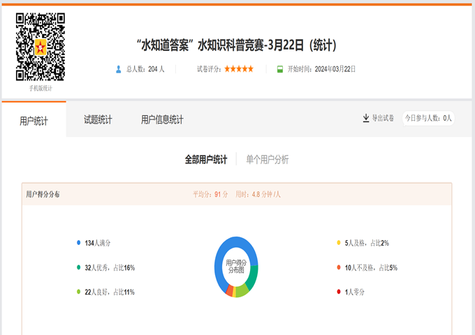 竞赛期间,依托“水闻天下”微信公众号发布每日题目、答题链接和二维码等,在次日发布的题目前附加前一日的答案及解析,内容覆盖节水护水、政策法规、河湖长制等。此次活动共吸引来自7个学院的1200余人次参与,在广大同学中宣传普及了节水护水知识。活动结束后,夏丹、周盼、张潇等20名同学获得较高积分,共有139名同学连续七天参赛且平均分在75分以上。