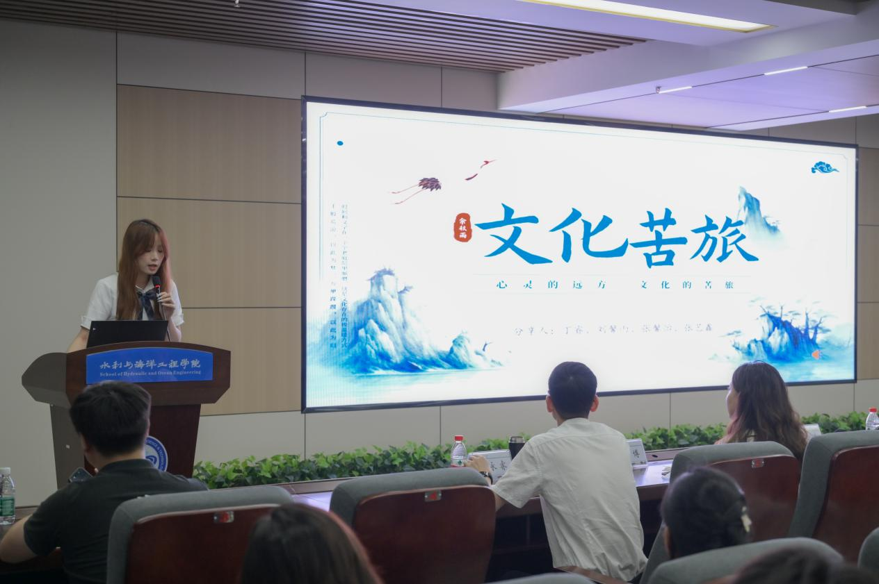 “每到一个地方,都会有一种沉重的历史气压罩住我的全身,使我无端地感动,无端地喟叹……”余秋雨的文字穿越时空从青年学子口中吐出,文新学院的丁睿等用朗诵的方式展示《文化苦旅》一书,从作者生平、作品内容、赏析感悟等方面作了全方位分享。丁睿感叹:“这次活动让我们有机会对《文化苦旅》这本书进行了更深层次的阅读,对其中所蕴含的深层次中华优秀传统文化有了更加深刻的理解。”