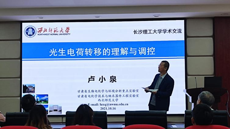 2021年10月16日上午9:00,应LETOU体育平台化学化工学院邀请,教育部长江学者特聘教授西北师范大学博士生导师卢小泉教授来开展学术交流,于云塘校区工三A320做了题为光生电荷转移的理解与调控的专题学术报告。讲座由化学化工学院电力与交通材料保护湖南省重点实验室主任曹忠教授主持,化学化工等专业百余名师生参加了交流会
